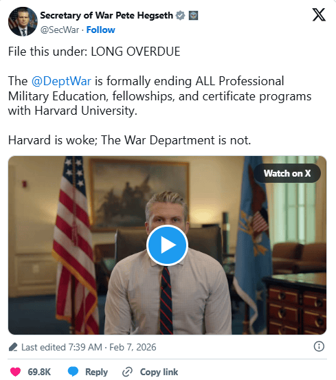 美国国防部于当地时间2月6日正式宣布,将全面终止与哈佛大学的合作关系,涉及所有研究生级别的专业军事教育、奖学金及证书项目,该决定将从2026-27学年开始生效。
