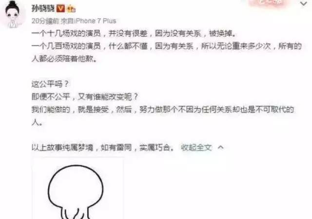 “一个十几场戏的演员,演技各方面并不差,就因为没有关系,被换掉。一个几百场戏的演员,什么都不懂,因为有关系,所以无论重来多少次,所有的人都必须陪着他煎熬。这真的公平吗?即便不公平,又有谁能改变呢?我们能做的,就是接受,然后,努力做那个不因为任何关系却也是不可取代的人。以上故事纯属梦境,如有雷同,实属巧合。”
