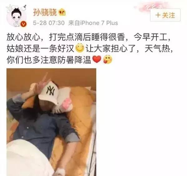 然后孙骁骁还在今早发了个微博让大家放心,并说自己打完点滴之后睡的很香,也在今早继续开工了。并开玩笑说自己还会是一条好汉!