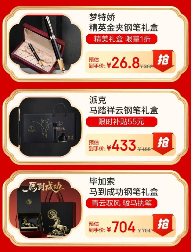 无论是馈赠亲友、商务往来,还是奖励自己,一支好用的钢笔往往是承载心意与祝福的佳品。梦特娇精英金夹钢笔礼盒采用人工打磨的类球形笔尖,有效改善飞白断墨,书写软弹顺滑,限量1折后预估到手价仅26.8元。派克马踏祥云钢笔礼盒融入祥云纹样设计,经典品牌匠心工艺打造,契合新春美好寓意,享限时补贴55元,折后预估到手价433元。毕加索马到成功钢笔礼盒专为高端书写与重要签名打造,内含金属马底座,寓意事业飞黄腾达,是高端礼赠的品质之选,预估到手价704元。