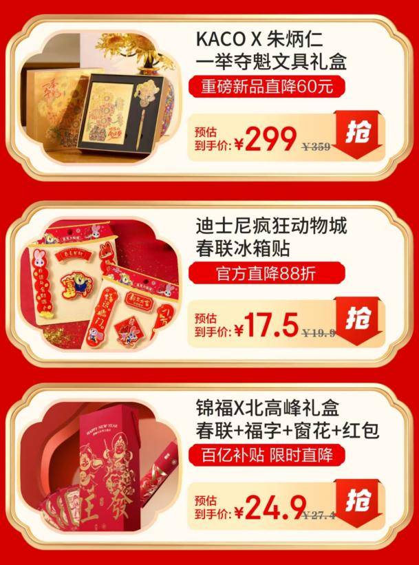 KACO×朱炳仁一举夺魁文具礼盒,将艺术家朱炳仁的画作《燃烧的向日葵》融入书写艺术,寓意向阳而生、学业夺魁,是送给学子的新春专属好礼,新品限时直降60元,预估到手价299元。迪士尼疯狂动物城春联冰箱贴,以经典卡通形象打造萌趣冰箱贴产品,为新年居家增添童趣年味,官方直降88折,预估到手价17.5元。锦福×北高峰礼盒内含春联、福字、窗花、红包等全套春节装饰,依托北高峰财神文化,寓意财运亨通,享百亿补贴限时直降,24.9元可以入手。