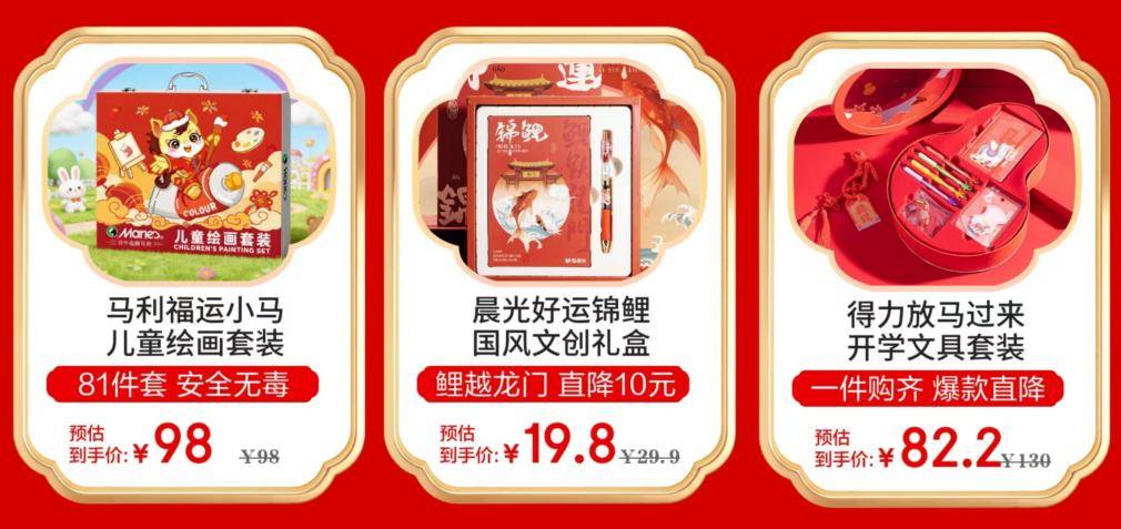 专为孩子打造的文具套装也是新年采购文具的重点,不仅能让新年增添亲子创作的乐趣,也能为新学期提前做好周全准备。马利福运小马儿童绘画套装内含81件绘画产品,一盒囊括孩子的绘画需要,画笔通过权威检测,安全无毒家长更放心,预估到手价98元。晨光好运锦鲤国风文创礼盒,升级锦鲤裸脊本,配套锦鲤中性笔,寓意鲤鱼跃龙门,直降10元后19.8元可入手。得力放马过来开学文具套装,8件套装包含笔、本、便利贴等书写好物,轻松搞定孩子开学文具置备,活动预估到手价82.2元。