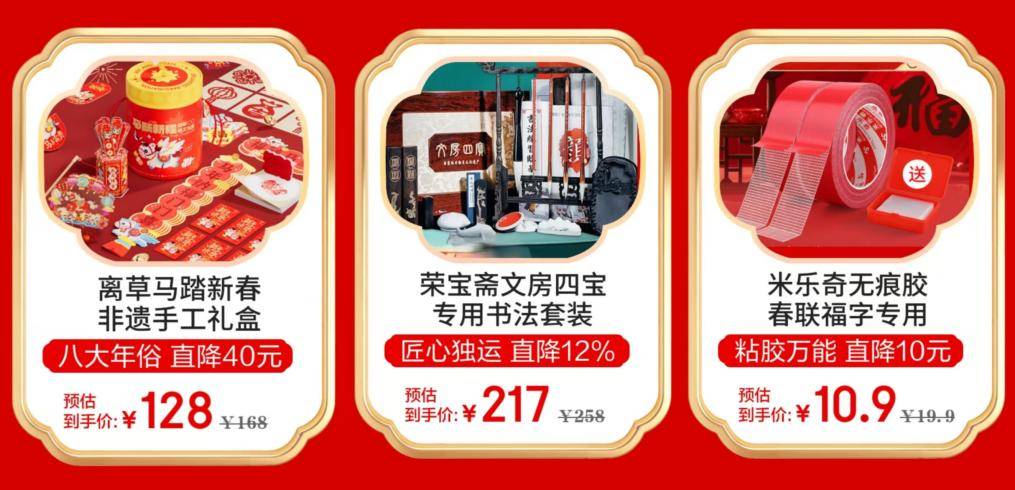 此外,注重传统文化体验与细节品质的消费者也能在此找到心仪之选。离草马踏新春非遗手工礼盒,内含八种可DIY的非遗手工玩具,让孩子在亲手制作中沉浸式体验传统年俗的趣味,活动直降40元,预估到手价128元。荣宝斋文房四宝专用书法套装,精选优质笔墨纸砚匠心搭配,质感出众适配书法创作与练习,限时直降12%,到手价217元,是书法爱好者的品质之选。搭配春联福字专用的米乐奇无痕胶,轻松搞定新春装饰贴挂,预估到手价10.9元。